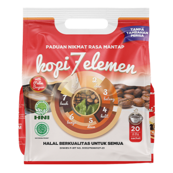 Kopi 7 Elemen adalah minuman yang terdiri dari kopi dengan 7 elemen tanaman: biji, akar, batang, kulit, daun, bunga, dan buah. KOMPOSISI: Kopi Instant, krimer nabati, gula, gula aren, herba pilihan PENYAJIAN: Tuangkan satu sachet ke dalam satu cangkir, masukkan air panas, aduk hingga merata.